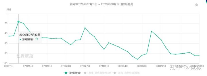 七麦数据显示,《剑网3:指尖江湖》于7月13登上App Store游戏畅销榜第17名,后期则呈下滑趋势。目前该作,畅销榜排名Top 84,基本稳定在Top 80内。