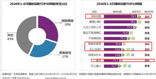 艺恩数据显示,今年上半年,播出过的悬疑剧占据整体数量30%,仅次于长期位于头部题材的都市剧,这意味着2020年是悬疑题材疯狂输出的一年。