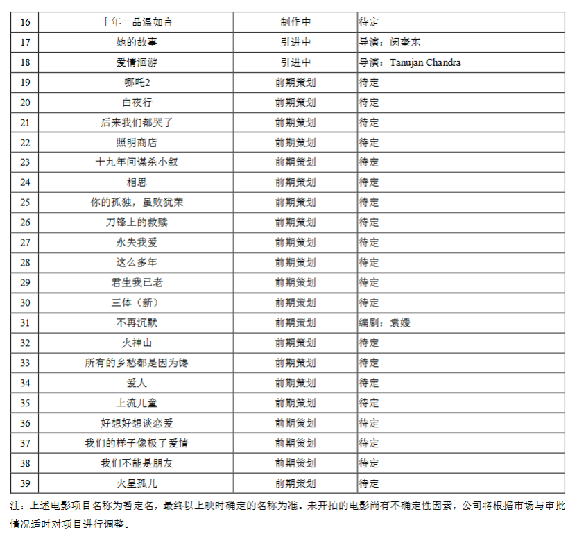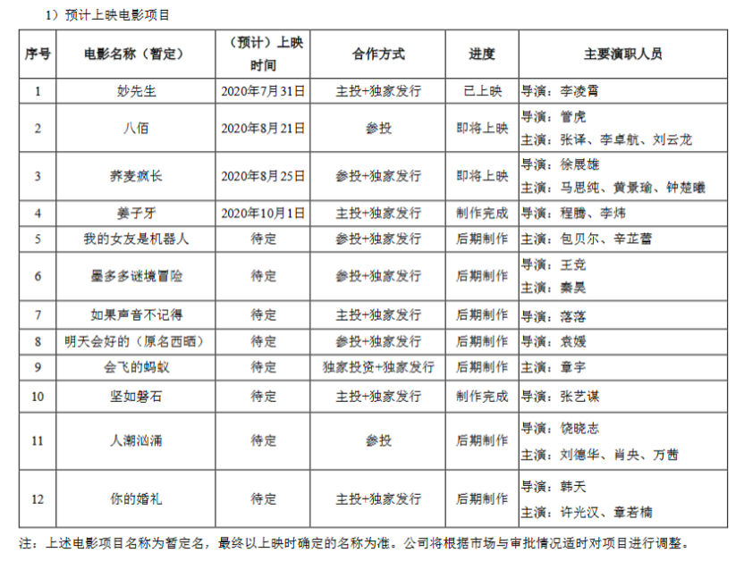 目前除了已上映的《妙先生》外,还有《姜子牙》《荞麦疯长》《坚如磐石》等电影项目均已制作完成,《如果声音不记得》《你的婚礼》《明天会好的》(原名《西晒》)《会飞的蚂蚁》《人潮汹涌》等影片在后期制作中,目前有12部电影项目处于已上映或预计上映状态。