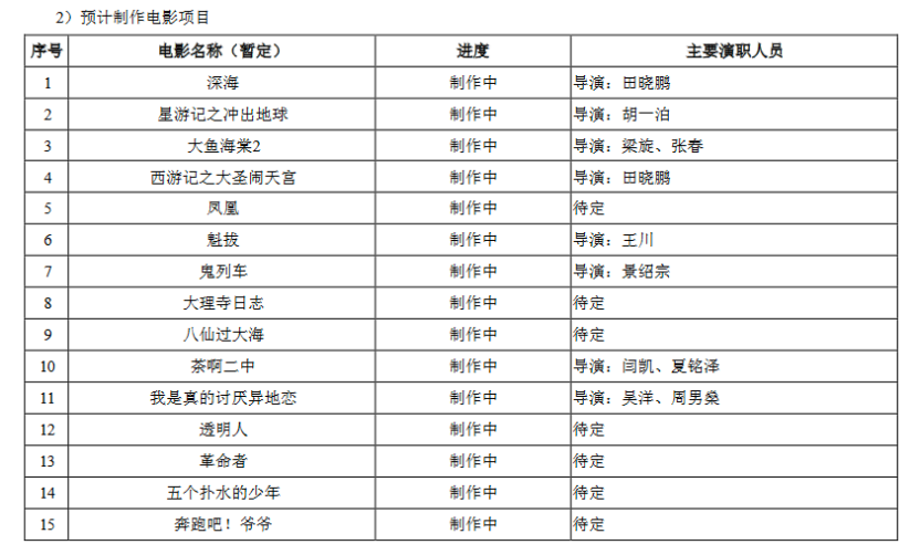 预计制作电影项目则达到了39部之多。在曝光的片单中我们看到了《西游记之大圣归来》导演田晓鹏领衔的《深海》《西游记之大圣闹天宫》两部新片,另外还有《大鱼海棠2》《魁拔》《大理寺日志》《哪吒2》《白夜行》《三体》(新)等知名IP的身影。
