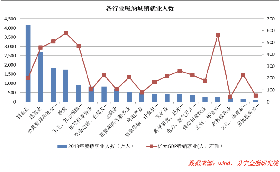 从各产业吸纳就业情况看,制造业、建筑业、公共管理和社会服务业、教育等四个行业居前;从单位GDP吸纳就业指标看,教育、水利环境、公共管理、卫生、建筑等行业居前。未来,这些吸纳就业能力强的产业,有望得到更多的金融资源支持。