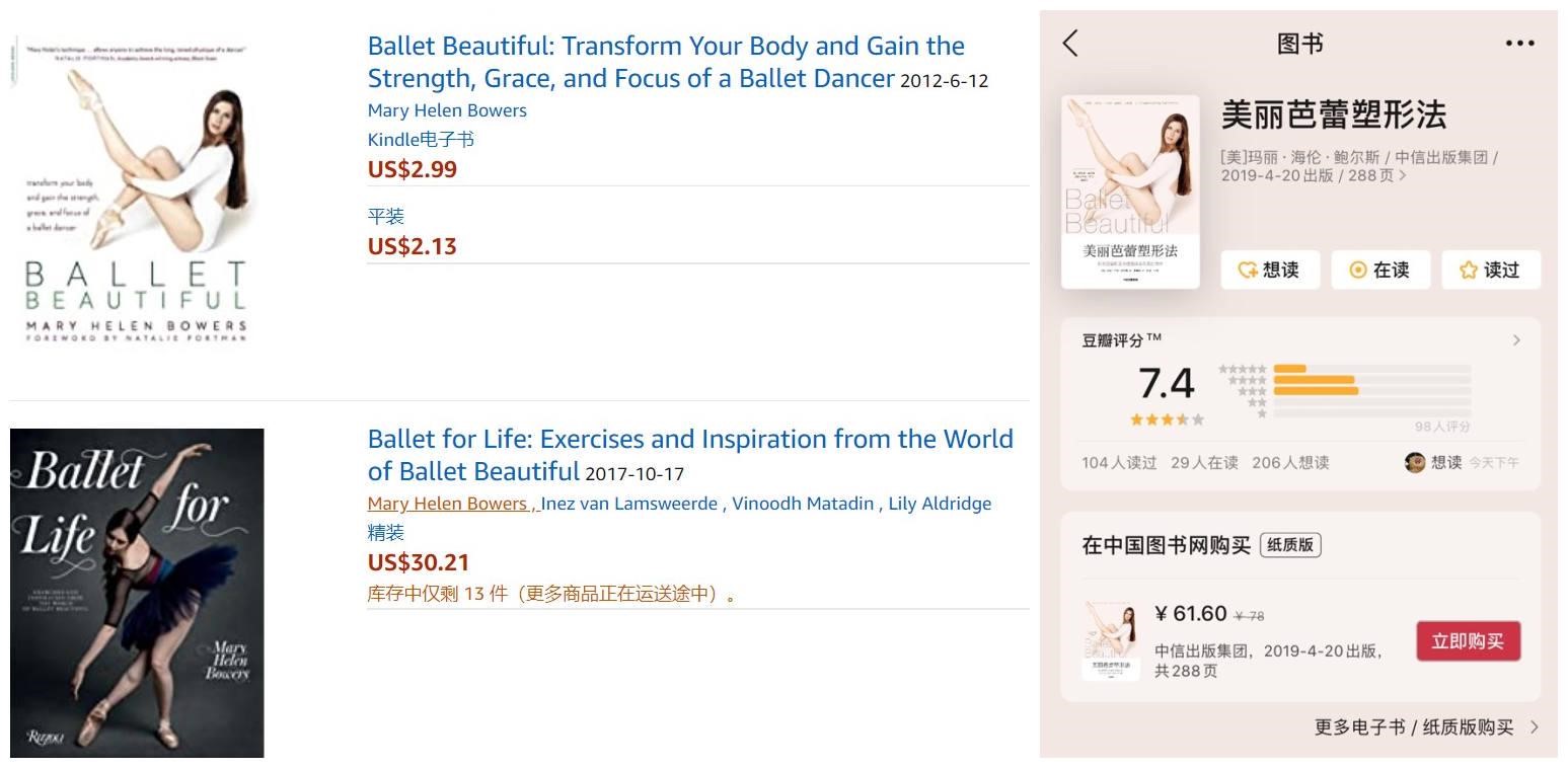 早在2012年,Mary Helen Bowers就出版了书籍《Ballet Beautiful》,2017年,又出了续集《Ballet for Life》。去年,中信出版社将她的第一本书汉化出版,但从豆瓣数据来看,反响平平,仅有104人标记读过,98人评分。
