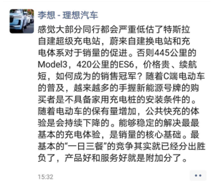 “感觉大部分同行都严重低估了特斯拉自建超级充电站,蔚来自建换电站和充电体系对于销量的促进。”理想汽车创始人李想在朋友圈直言,能够稳定地解决最基本的充电体验,是销量的核心基础。