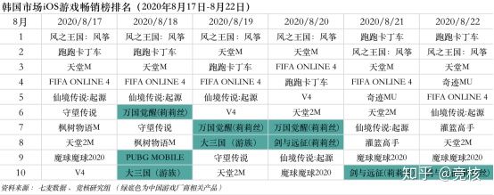 20年8月17日—8月22日韩国IOS游戏类畅销榜中,国产手游表现均有下滑。莉莉丝游戏《万国觉醒》《剑与远征》两款手游均只上榜三天便跌出前十。而腾讯《PUBG MOBILE》在8月18日有过短暂露头,排名第八,随后跌出榜单