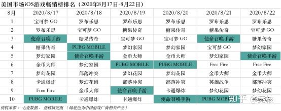 2020年8月17日—8月22日美国IOS游戏类畅销榜中,腾讯游戏《PUBG Mobile》《使命召唤手游》两款游戏上榜。