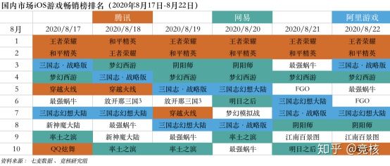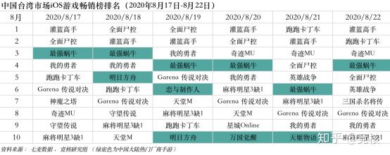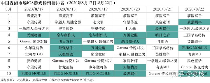 中国香港市场2020年8月17—8月22日IOS游戏类畅销榜中,腾讯《PUBG Mobile》、网易《明日之后》、吉比特.青瓷数码《最强蜗牛》、4399《天姬物语》均有上榜、鹰角网络《明日方舟》、莉莉丝游戏《万国觉醒》、叠纸游戏《恋与制作人》均有上榜。
