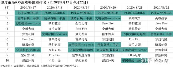 2020年8月17日—8月22日印度IOS游戏类畅销榜中,腾讯《PUBG Mobile》《使命召唤手游》、龙创悦动《守望黎明》《帝国崛起》、莉莉丝《万国觉醒》上榜。