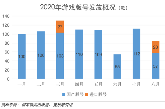 具体到每个月游戏版号下发数量上,1月—8月(截止至8月23日)分别为:100款、106款、129款(包含27款进口游戏版号)、110款、109款、55款、169款、85款(包括28款进口游戏版号)
