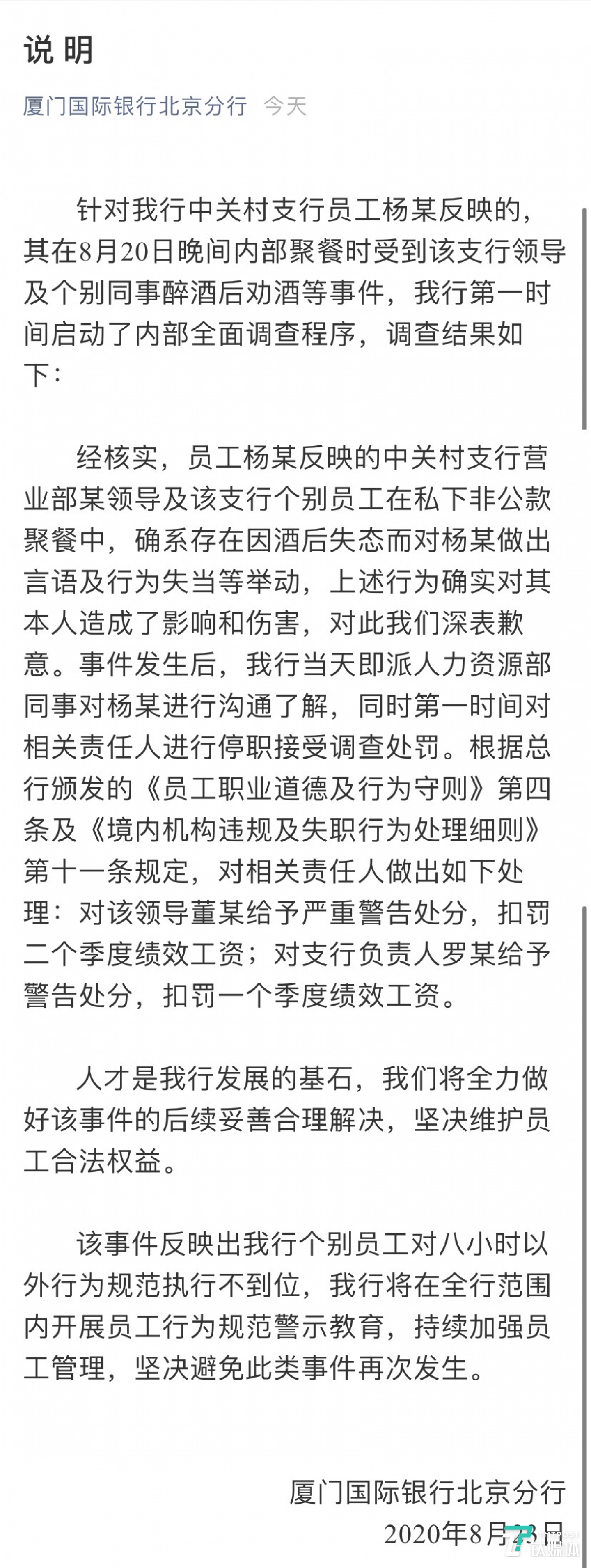 8月24日,厦门国际银行北京分行官微发文回应称:经核实,员工杨某反映的中关村支行营业部某领导及该支行个别员工在私下非公款聚餐中,确系存在因酒后失态而对杨某做出言语及行为失当等举动。