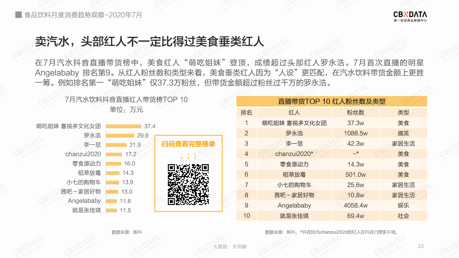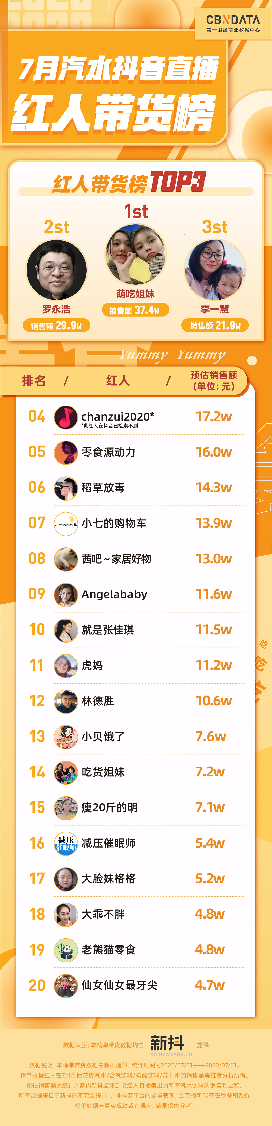 在7月抖音直播汽水带货榜中,上榜博主多为粉丝量50万以下的中腰部达人,且类型聚焦于美食、家居生活等垂直领域。其中,粉丝量仅37.3万的美食达人“萌吃姐妹”荣登榜首,带货实力力压拥有1000多万粉丝的罗永浩和4000多万粉丝的Angelababy。