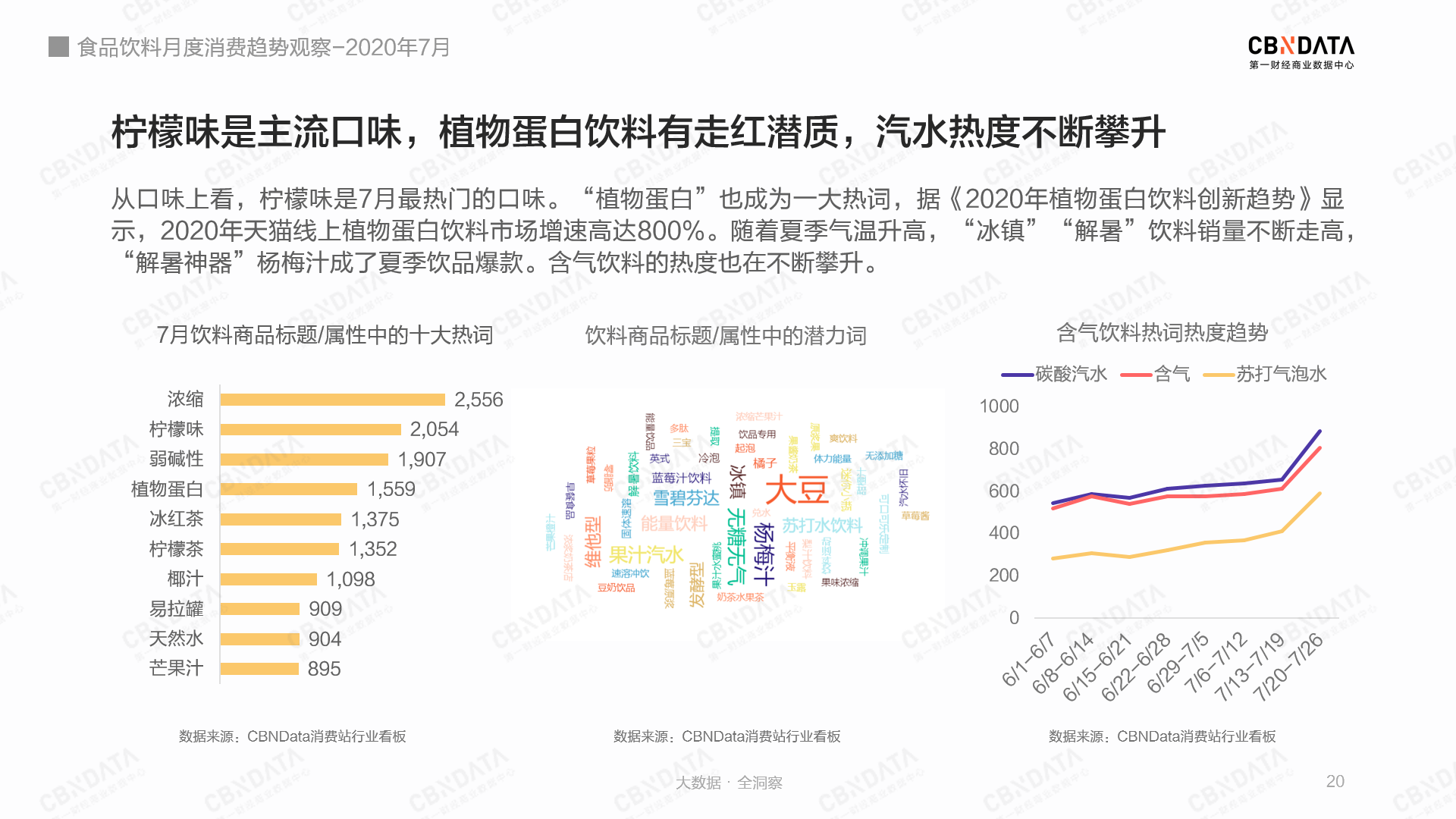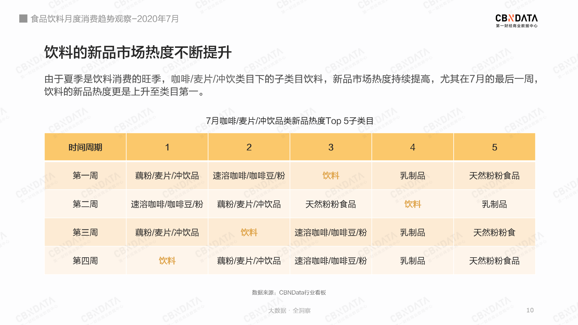 CBNData消费站发布的《2020年7月食品行业月度消费趋势观察》(以下简称CBNData报告)也显示,饮料类目新品热度在7月份不断提升,并于7月最后一周成为类目第一。