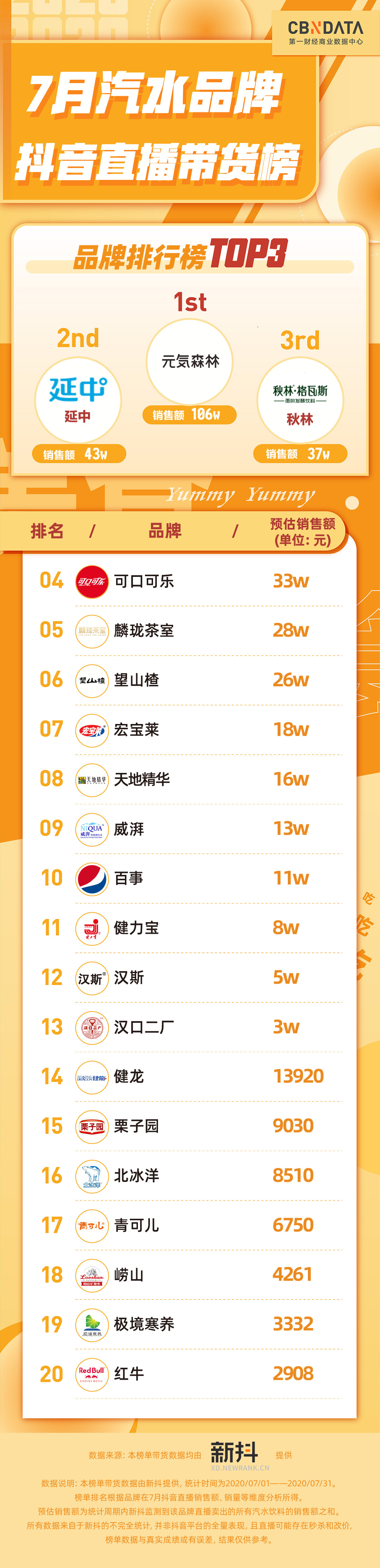汽水的大热,也有赖于直播间的带货推广。根据短视频直播数据工具新抖的统计,7月仅抖音平台就有1645场汽水直播,环比6月增加了38.8%!