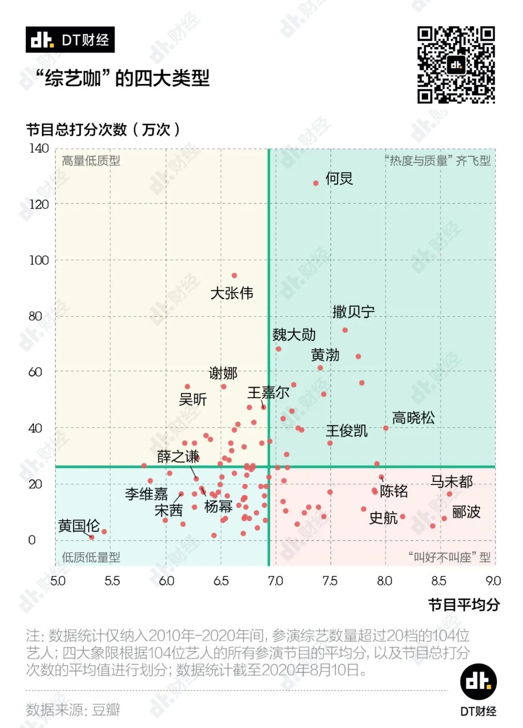我们找到了十年间参与综艺节目达到20档的104位艺人,并根据节目打分人数(节目打分人数越多,一定程度上意味着这个节目的热度越高)和参演综艺平均分两大维度进行聚类分析(四大象限根据104位艺人的所有参演节目的平均分和平均打分次数进行划分),得到综艺咖的四种类型。