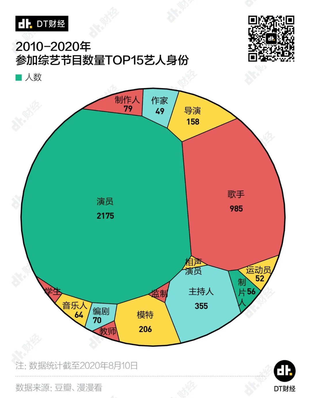 但现在,局面开始向综艺倾斜,演戏好的、唱歌好的艺人都一股脑地上起了综艺。我们统计了最近10年的综艺节目嘉宾的身份标签,发现事实也大抵如此。