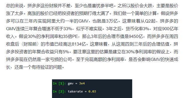 雪球用户@愚钝博士做了一个简单计算。“假设拼多多可以在三年内实现阿里大约一半的GMV,也就是3万亿。这意味着从Q2起,拼多多的GMV连续三年复合增速不低于33%,似乎不难实现。3年之后,货币化率3%,对应900亿年收入。假设30%的净利润率和35倍PE,那么3年后的合理市值是9450亿,而拼多多在周四收盘后(财报前)的市值已经高达8134亿。这意味着,从这周四到三年后的合理估值,拼多多投资者的年复合收益只有5%。要注意这里的估算是建立在30%净利润率的假设上,而拼多多现在仍然是一家亏损的公司。至于兑现高额的净利润率,是否会影响GMV的快速成长,还是一个有待验证的问题。”