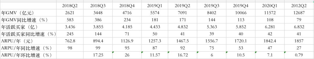19Q2是年活跃买家和ARPU的增长双击,19Q3-20Q1百亿补贴战略的持续性维持了年活跃买家增速,但ARPU一侧未有足够惊喜。
