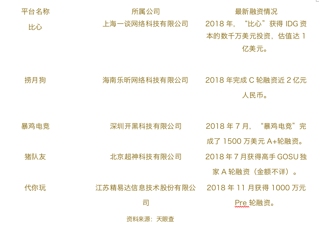 这种大潮下各路电竞陪玩平台迅速崛起,大量资金也陆续涌入,比心、捞月狗、伴伴等陪玩平台都是这个浪潮下的产物。以此次事件的主角比心为例,根据天眼查的数据显示,其成立至今累计获得两轮数千万美元融资,尤其是2018年3月获得IDG资本的数千万美元投资后,估值已经达到了一亿美元。与此同时,其他多家陪玩平台也都在过去几年获得过一至两轮融资,但近两年都已经逐渐减少。