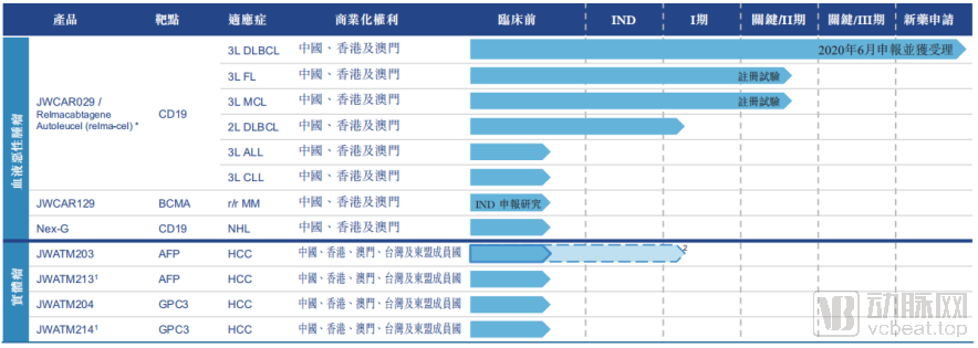 说回药明巨诺,公司目前的管线全部都来自于Licence in,其中既包括了从JUNO引进的CD19和BCMA靶点的产品,也包括了从优瑞科引入的几款AFP和GPC3靶点的相关产品。