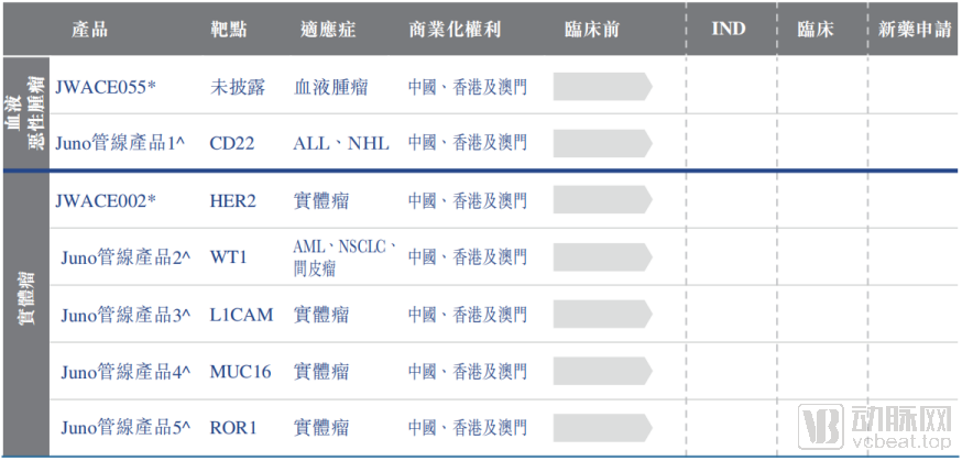 药明巨诺拥有在中国研发及商业化JUNO构建的T细胞产品的优先购买权。因此未来,随着产品管线的推进,药明巨诺或将继续从JUNO引进多条药物管线。目前来看,CD22、HER2、MUC16等热门靶点的相关产品,都在药明巨诺的考虑范围内。