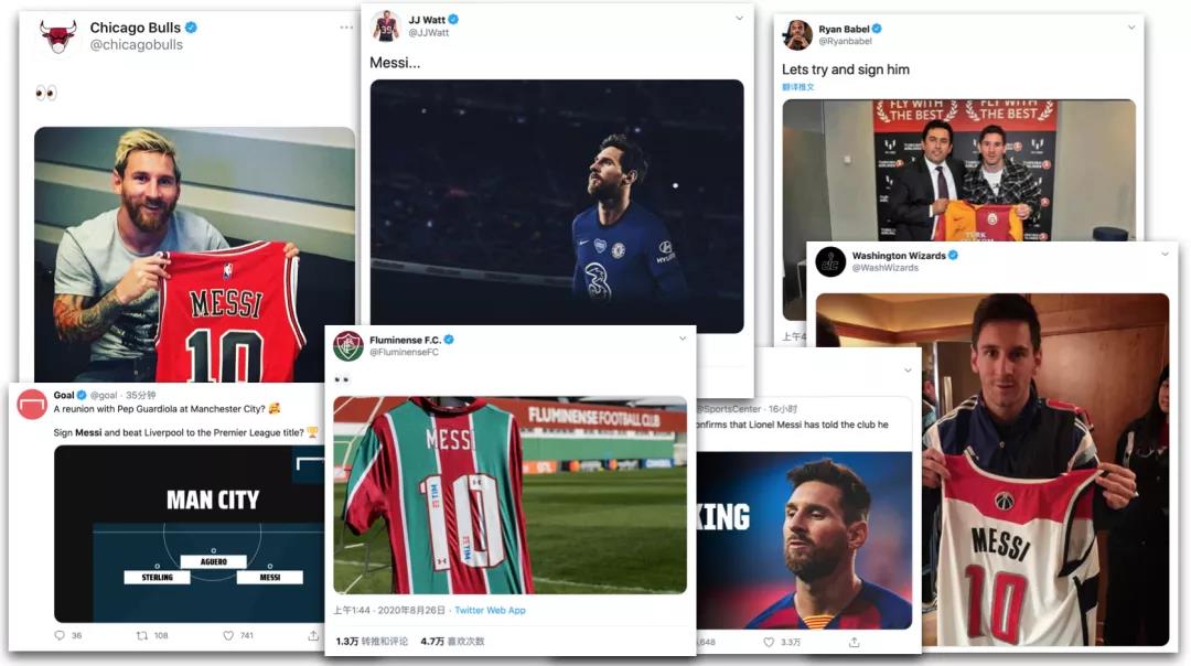 梅西的转会风波,也在社媒上引发了一波「跨界狂欢」。诸多知名体育俱乐部与明星们,都「蹭」起了球王转会的热度。