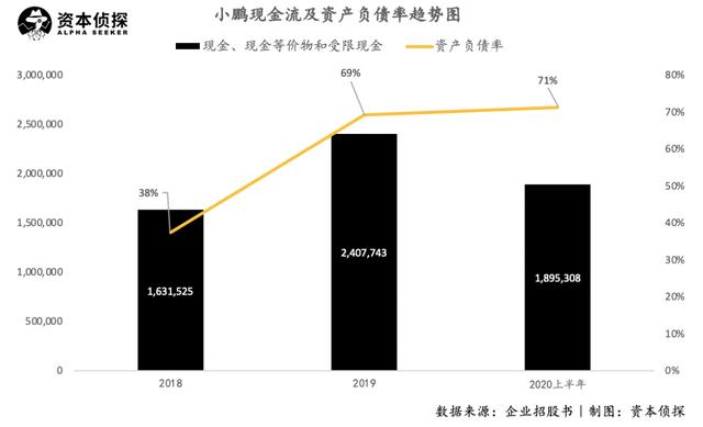 同时,小鹏的资产负债率也有进一步升高的趋势,在2018年底开始量产后,2019年资产负债率陡升至69%,今年上半年进一步上升至71%。