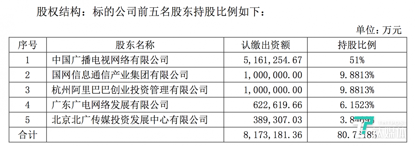 作为国内除三大运营商外唯一一张5G牌照的拥有者,标的公司在筹划期间就备受期待,被称为“中国神网”。如今,参加方终于浮出水面。公告显示,标的公司前五大股东分别为中国广播电视网络有限公司、国家电网旗下国网信息通信产业集团、杭州阿里巴巴创业投资管理有限公司、广东广电网络发展有限公司、北京北广传媒投资发展中心有限公司,注册资本1012亿元。