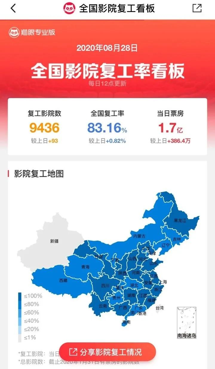 截至发稿,除重映电影外,仅有《八佰》一部电影苦苦支撑大盘,同期《我在时间尽头等你》《荞麦疯长》也均属于小成本剧情电影,猫眼预测内地票房不过在几亿级别。而根据猫眼专业版数据,截至8月28日,全国复工影院数为9436家,复工率达83.16%,而票房一路领先的《八佰》全国上座率却仅有21.8%。