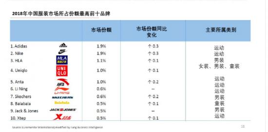 2018年中国服装市场所占份额最高的前十品牌中,有6家是运动品牌。