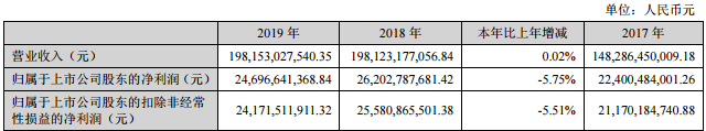 财报显示,2019年,格力电器实现营业收入1981.53亿元,同比增长0.02%;归属于上市公司股东的净利润为246.97亿元,同比减少5.75%,系格力五年来净利润首次下滑。