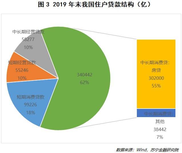 虽然从整体看,我国的居民杠杆率很高,但结构却极其分化。从住户贷款的构成看,包含了消费贷款和经营性贷款两部分,消费贷款占比为80%,其中又以中长期的住房贷款为主,在住户贷款中占比超过50%,而一般认知中的短期消费贷款仅为9.9万亿,占住户贷款的18%(见图3)。