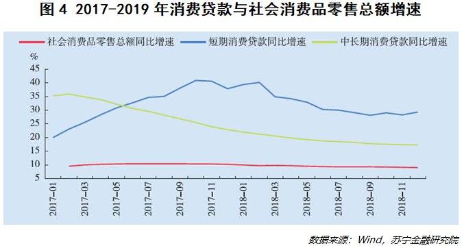 但如果从近几年数据看,消费金融的增速在加快。2017年年间,短期消费贷款同比增速从19.9%骤增至40.9%,与同期中长期消费贷款呈现“一升一降”,且增速上升趋势明显偏离同期社会消费品零售总额增长趋势。到了2018年,短期消费贷款同比增速虽然有所回落,但总体仍维持在28.1%-40.1%的较高区间,而近五年平均增速为27%,同期中长期消费贷款增速也仅为18%-25%。2019年,住户部门短期消费贷款同比增速有所回落,但仍处于较高增长区间(见图4)。