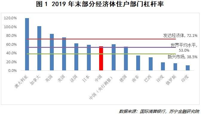 国际清算银行公布的我国2019年居民杠杆率为55.6%,但据人民银行测算,其数值已经超过60%,为了下文便于比较,我们仍然采用国际清算银行数据。