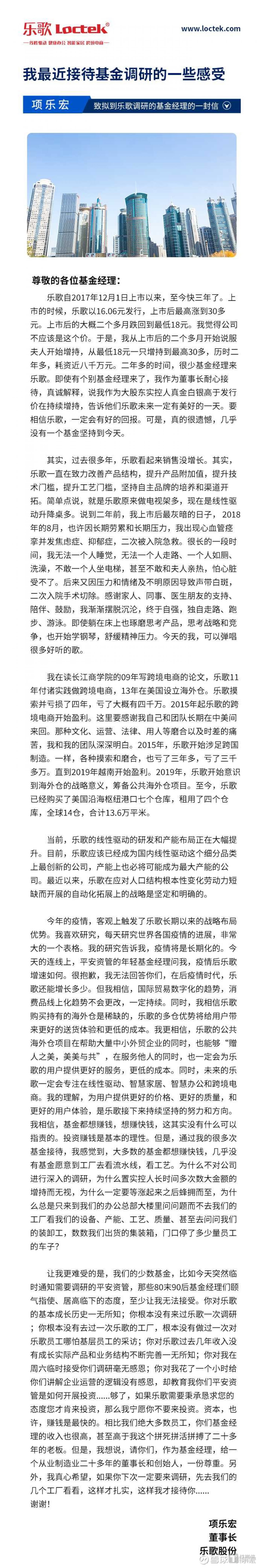 随后又发布长文,“那些80末90后基金经理颐指气使、居高临下的态度,让我无法接受。你对乐歌的基本成长历史一无所知;你根本没有来过乐歌一次调研……”质疑平安资管基金经理调研中的专业性以及居高临下的傲慢态度,表示“不欢迎平安资管的基金经理来公司投资”。