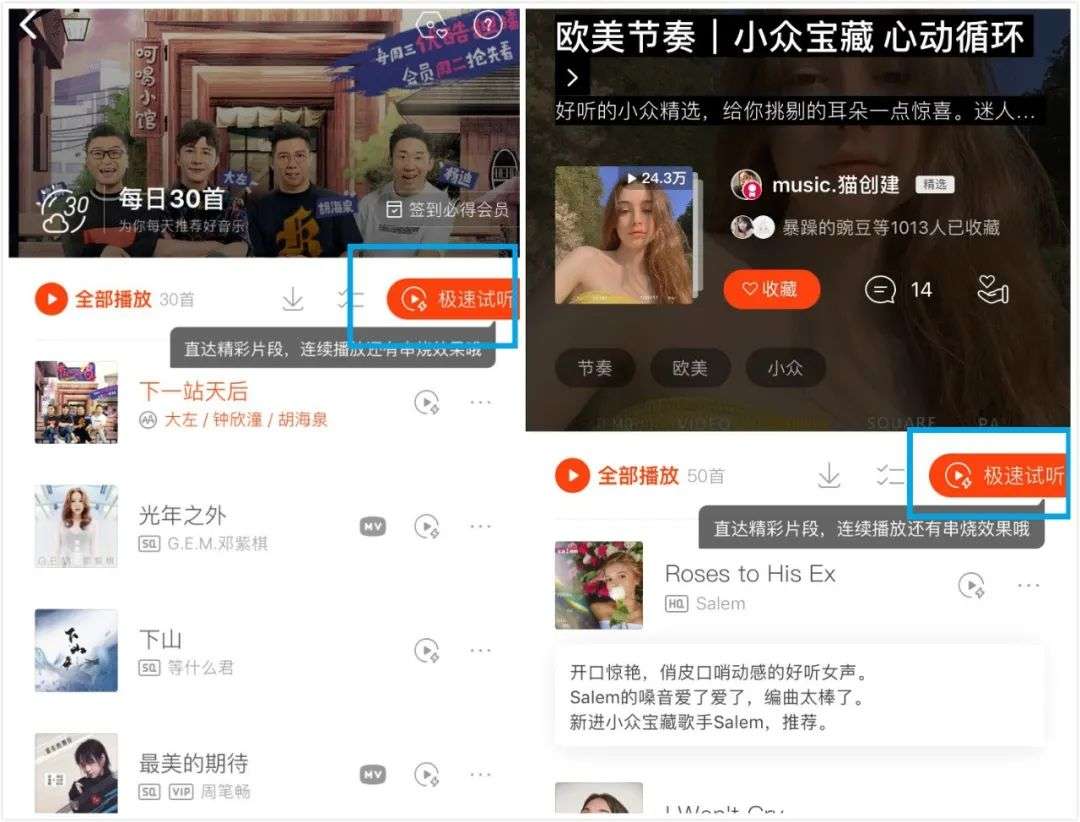 近日,虾米音乐上线极速试听功能,通过大数据算法选取歌曲中的30秒精华片段,使得用户可以通过极速试听快速判断一首歌是否符合自己的音乐品味,从而收藏或下载,以帮助用户更便捷地发现好音乐。