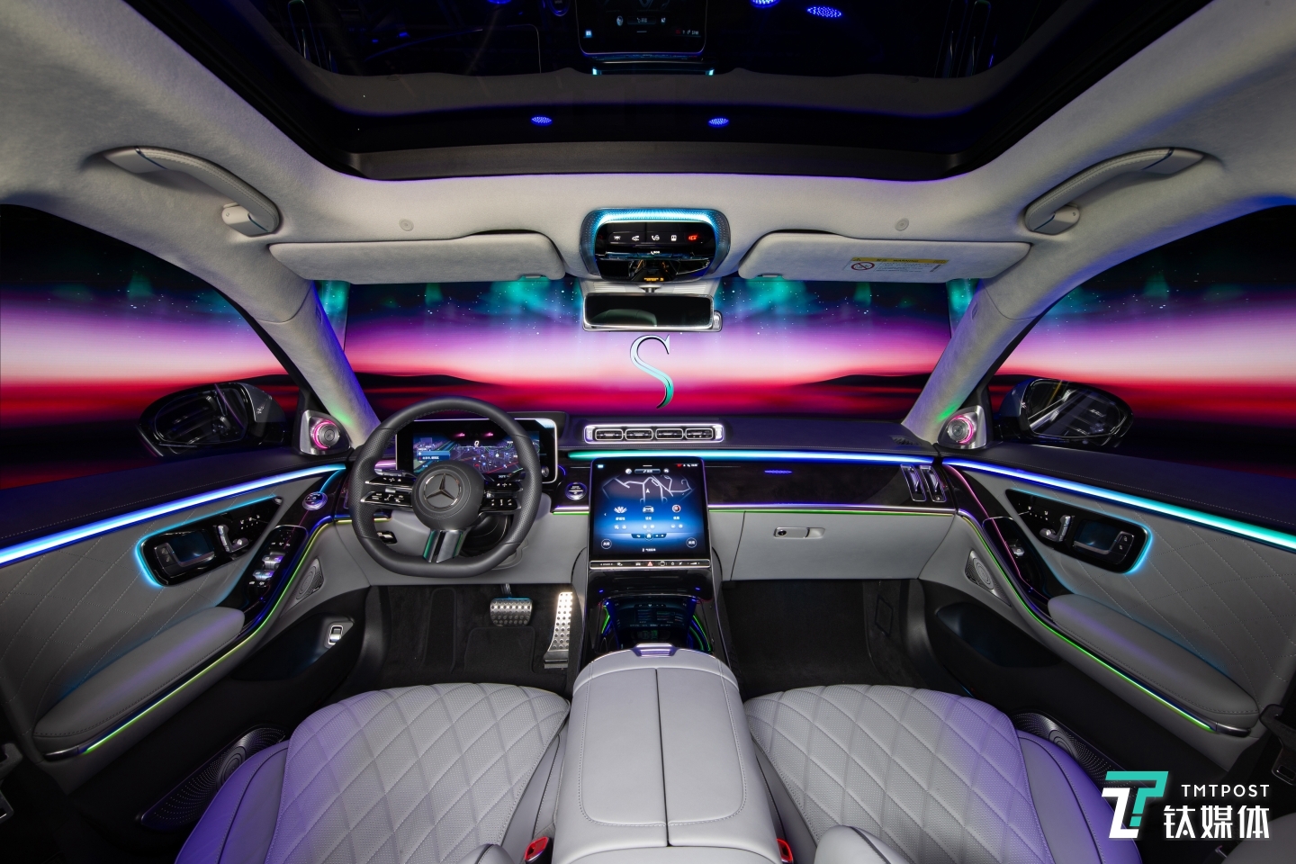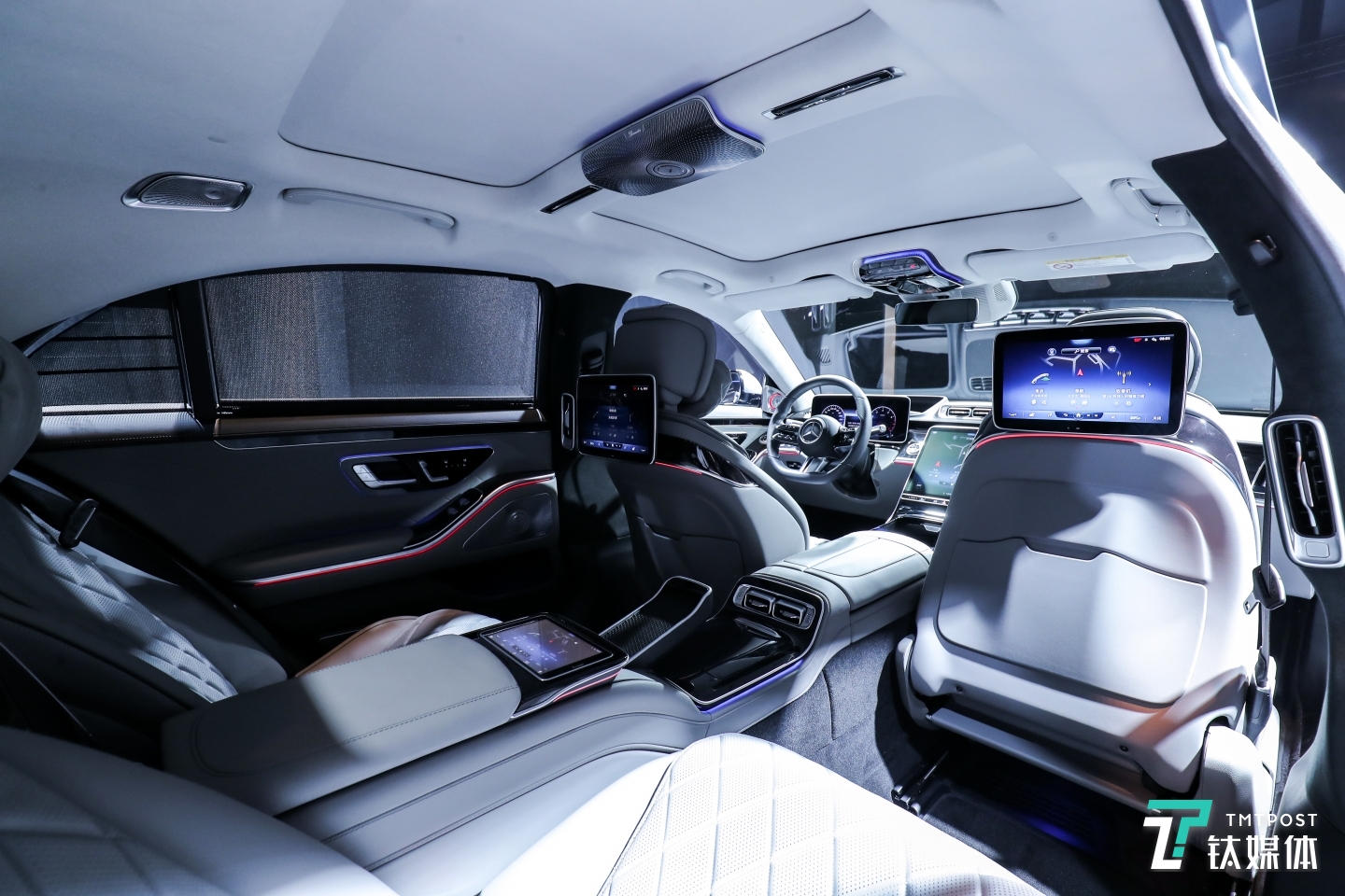 后排乘客拥有娱乐大屏系统,同时可以和驾驶员侧面的中控大屏内容互投。座椅也提供多达几十种的按摩程序,同时首次提供了头颈加热功能。