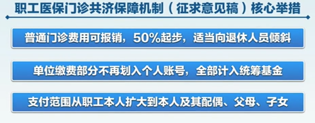 8月26日,国家医保局发布《关于建立健全职工基本医疗保险门诊共济保障机制的指导意见(征求意见稿)》,向社会公开征求意见。这份意见一共提出了五条改革措施,其中第二条是“改进个人账户计入办法”。