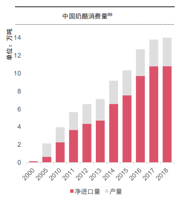 去除产品定义有较大区别的巴氏奶以外,中日两国在酸奶、豆奶、奶酪这三个品类的消费量上,有较大的差距。其中奶酪产品线上,日本奶酪的人均消费量上超过中国达39.6倍。而消费额上更是夸张的超过了中国46倍。并且奶酪制品在生产、销售、保质期等多方面拥有比巴氏奶更大的优势。目前中国奶酪消费量中,绝大部分的奶酪制品均为进口,国产替代的潜力相当巨大。