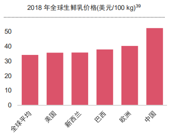 在占养殖成本最大的饲料成本方面,受中国气候和耕地保有量的影响,相关商业饲料基本以海外进口为主。以苜蓿为例,2015年中国奶牛养殖场和牲畜养殖场共消耗了300万吨优质苜蓿,其中进口苜蓿达到120万吨,并且相关饲料进口规模还在不断扩大。据普华永道统计,2018年,中国生鲜乳价格比中国最大乳制品进口国新西兰的价格高出46%,比全球平均水平高出53%。