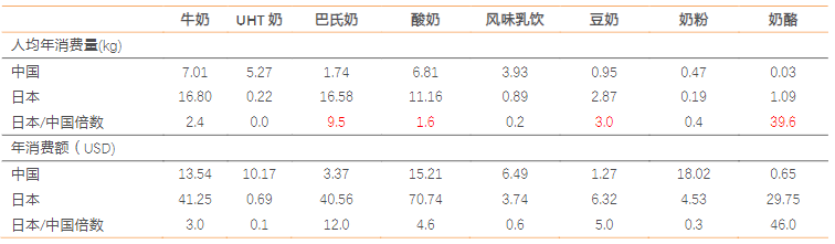 从长期看,中国乳业的转型升级势在必行。但从产品看,或许有更好的选择。以和中国饮食口味接近的日本为例,目前中日两国的乳制品消费量有较大的差距。