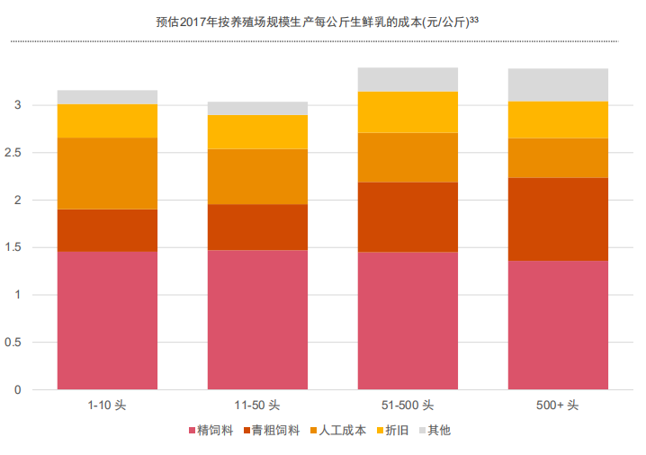 在价格方面,生鲜乳(原料)和冷链在国内的高昂成本,极大的影响了巴氏奶的普及。目前,生鲜乳的成本大致包括精饲料、青粗饲料、人工成本、折旧、其他杂费五大方面。近年来,随着规模化养殖率的不断提高,牛奶生产的人工成本也在逐步降低。然而人工费用的降低却被商业粗饲料、电力、兽医服务等成本抵消。