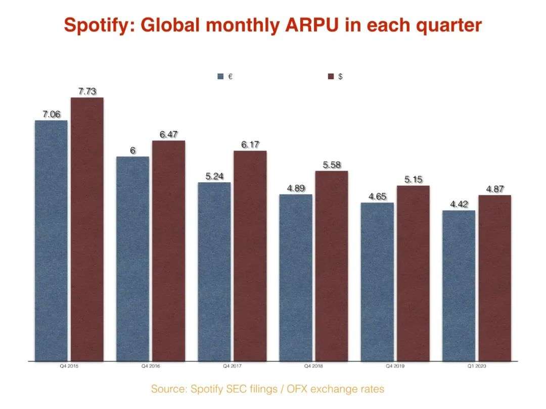 总而言之,Spotify跟风"直播",不仅有疫情下的外部原因,也有其面临收入增长困局的内部原因。受制于Spotify长久以来的单一业务结构,其订阅用户增长遭遇瓶颈时,付费用户的ARPU也在持续下滑,而这一缺陷在疫情之下被显著突出,向线上探索也属于情理之中。