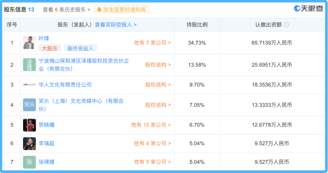 笑果文化部分股东持股情况(图片来源:天眼查)