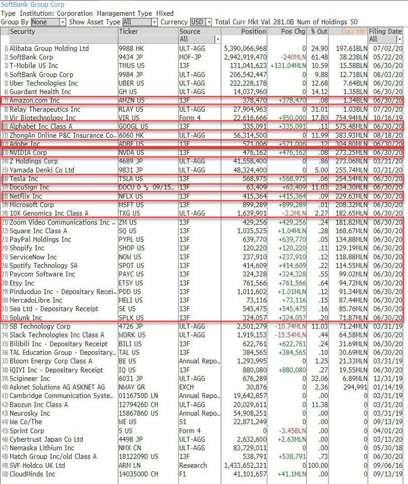 对于媒体就以上消息的求证,软银的发言人拒绝发表评论。然而,却有财经博客提供了直接证据,在二季度软银新进的科技股名单中,包括了特斯拉、亚马逊、谷歌母公司Alphabet、英伟达、奈飞、Zoom、拼多多等。
