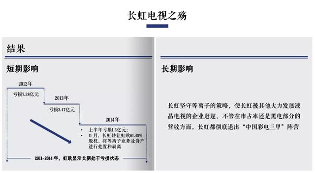 结果大家也都知道,长虹从2012年开始每年亏几个亿。当它坚守等离子的时候,别的企业都在大力发展液晶。