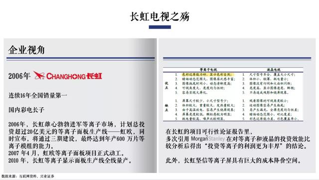 长虹还请摩根士丹利做了可行性论证报告,比较等离子和液晶的投资效能,发现投资等离子的利润会更加丰厚,而且等离子在未来具有很大的成本下降空间。