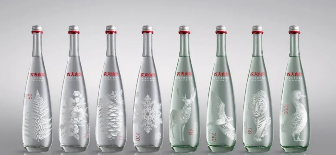 早在2015年,农夫山泉也打入了高端水市场,推出农夫山泉玻璃瓶矿泉水、适合婴幼儿的天然饮用水以及适合学生的天然矿泉水。为了打造高级感,农夫山泉通过广告不断宣传其优质水源地,邀请英国设计工作室Horse为其高端水产品设计包装。