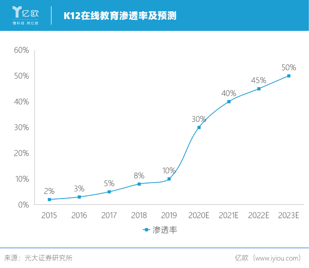 根据艾瑞咨询数据,2019年中国在线教育市场规模3225.7亿元,同比增长28.1%,预计未来三年市场规模增速仍将保持在19-24%之间。疫情期间,K12在线教育渗透率加速提升,预计将由2019年的10%上升到2020年的30%,在2023年将超过50%。