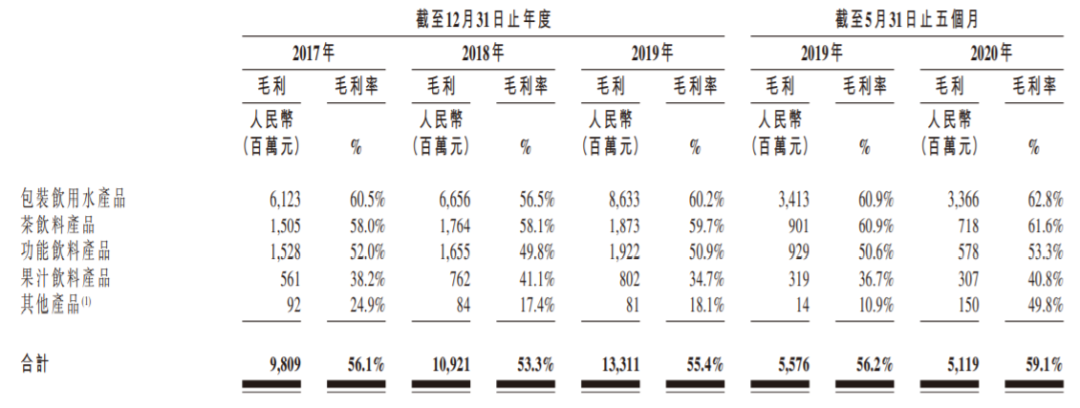 农夫山泉的招股说明书显示,公司旗下五大类产品中,包装饮用水产品从2017年至2020年毛利率几乎维持在60%以上;茶饮料和功能饮料的毛利率基本也维持在50%以上。