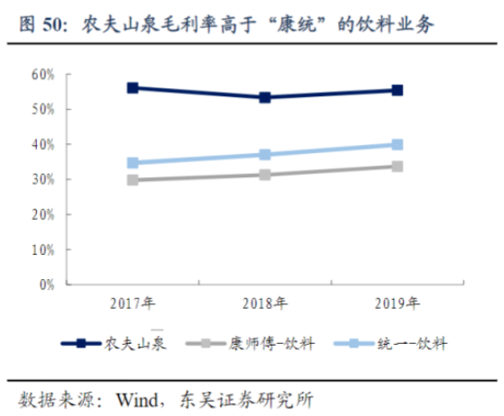 申万宏源证券研究所数据显示,农夫山泉在国内的主要竞争者娃哈哈、华润怡宝和百岁山的同等价位瓶装水毛利率分别为31%、41%、38%,远低于农夫山泉。东吴证券研究所数据也表明,康师傅和统一的饮料业务毛利率远低于农夫山泉。