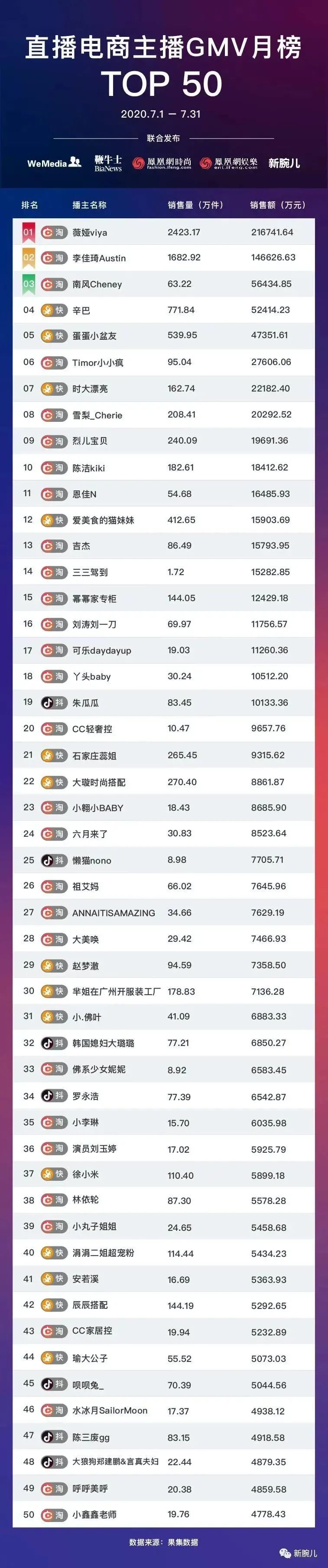 《直播电商主播GMV月榜top50》显示,行业top50主播中有29位是淘宝主播,快手主播14位,抖音主播7位。销售额过亿主播中,14人为淘宝主播,4人快手主播,抖音主播只有朱瓜瓜一人。抖音带货主播前30名总销售额不及薇娅、李佳琦一个人的GMV。
